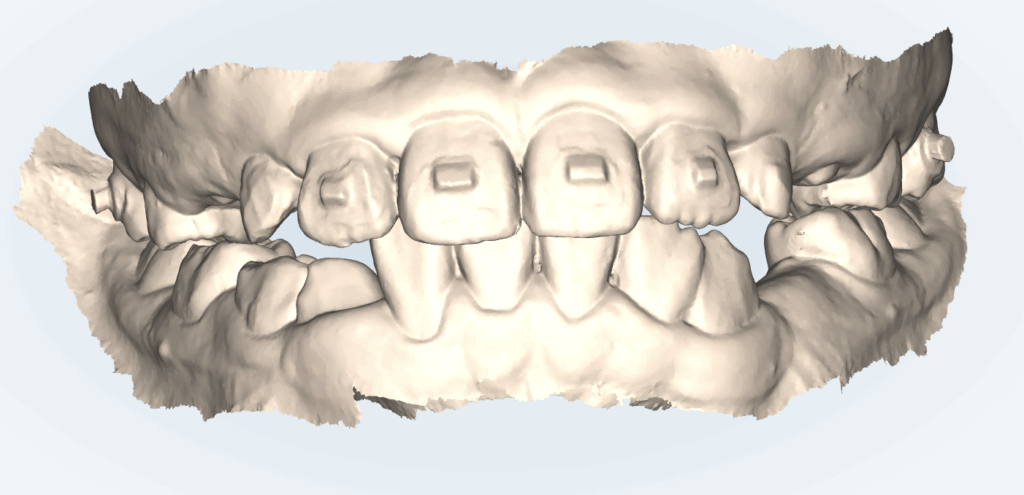 最初が↓この写真だったので、前歯が正しい位置関係になりました。ただ、左下のはが癒着歯(隣合わせの2本の歯がくっついている状態)のため動かせる限界もあります。