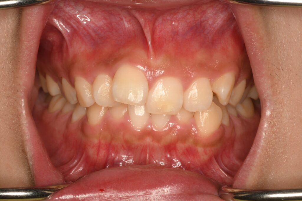 前歯がデコボコしているのが気になる20代女性のケースです。このよう場合に、「よくある質問が前歯だけで治したい」と聞いていることです。「前歯だけでの矯正治療はお勧めできない」と答えます。理由は整えることはできるかもしれませんが、出っ歯になったり、そもそもが前歯だけで矯正治療をしてはダメなこともあります。ネットの上に書いてある甘い言葉に惑わされないようにして下さい。ただ、前歯だけでできるようなケースもあるのは事実です。そのことを見極めるためにも精密検査は必要です。