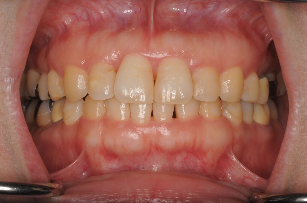 治療を全て終えて、1ヶ月後の写真です。最初から比べたら前歯の状態が整っています。整ったことで歯と歯の間の歯茎に黒い影が目立つようになっています。治療を始める前からある程度予想をして伝えていましたのでトラブルにはなっていません。これ以上悪くならないように経過を診させてもらっています。