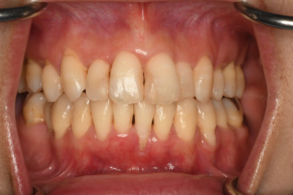 下の前歯の歯ぐきの位置が変化をしています。今後、悪い方へ変化しないか要注意です。