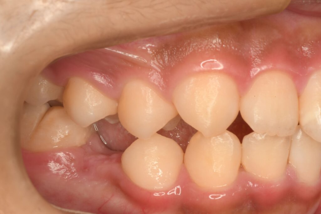 正面から観るとわかりずらいと思いますが、噛み合わせが微妙にズレています。ズレている理由は、歯が1本もともと無いからです。いわゆる先天欠損です。以前から把握できていましたが、色々と相談をしながらどうしようかを考えていました。最初は子供はをできる限り使っていこう‼︎という計画でいましたが、あまり持ちませんでした。歯がなくなっても本人がそれほど気になっていなかったこともあり、歯が無い状態で過ごしつつ、歯の病気にさせないように関わり続けていました。歯を削ったり、インプラントにしたりするのは、できる限りおすすめしたくなかったので矯正治療の提案をしていました。